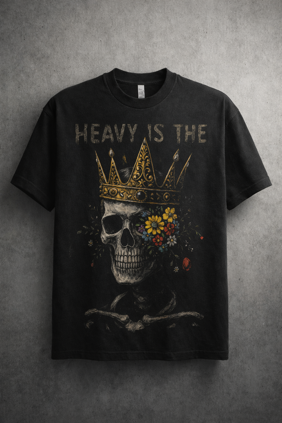Black t-shirt with graphic design featuring skulls, a scythe, and text on a dark background