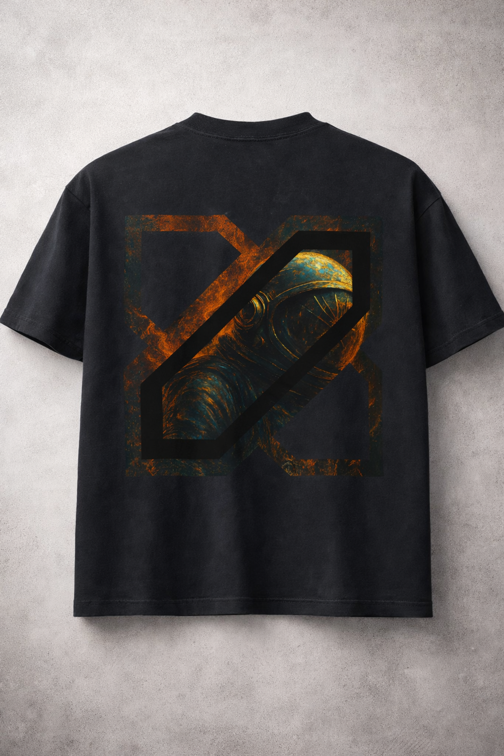Black t-shirt with gold graphic design featuring text and architectural elements on a gray background